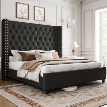 Elegant King Size Bed Frame with Tall Velvet Headboard – No Box Spring Needed