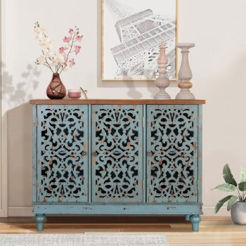 Rustic Carved Wood Accent Cabinet with 3 Doors – Farmhouse Sideboard Buffet