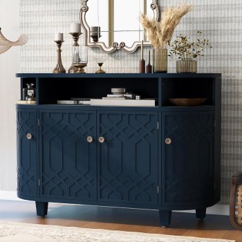Retro Curved 4-Door Accent Cabinet with Adjustable Shelves – 48” Solid Wood Console