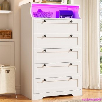 White LED Light Dresser with 5 Drawers & 2 Shelves for Bedroom